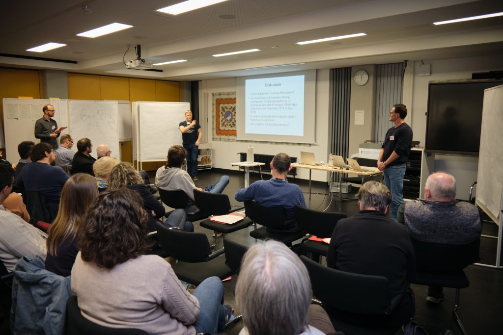 Nach der Mittagspause ging es in eine erste Workshop-Phase, die den Teilnehmer:innen ermöglichte, die Abituraufgaben und Rahmenbedingungen der 2000er Jahre mit den heutigen zu vergleichen. Auch das mündliche Abitur wurde in einem Workshop thematisiert und interessierte viele der Teilnehmer:innen. Aus einem Workshop kam der Wunsch auf, Vorschläge zu den Rahmenbedingungen zu machen, hieran wird das cosh-Kernteam weiter arbeiten. Zum Abschluss des Tages gab es Vorträge von Frank Göring (Universität Chemnitz) über mathematisches Kalkül in Abituraufgaben und vom Duo Benjamin Rott und Frank Scheja (beide Universität Köln), die sich konträr dazu mit den prozessbezogenen Kompetenzen in Abituraufgaben beschäftigt haben.